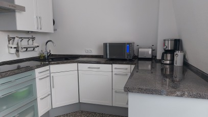ausgestattet mit Kaffeemaschine, Wasserkocher, Toaster, Microwelle inkl. Backofen sowie Handtücher und Bettwäsche